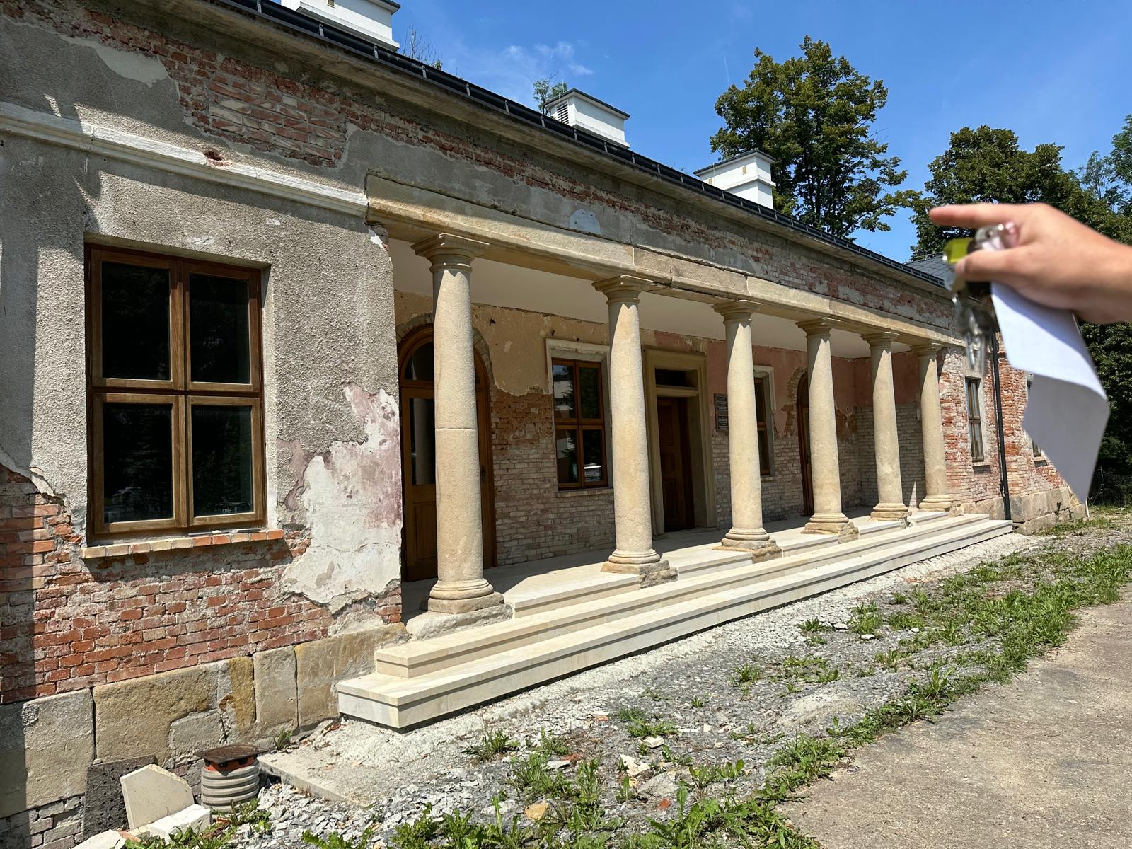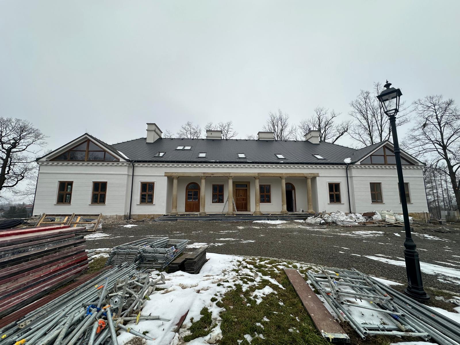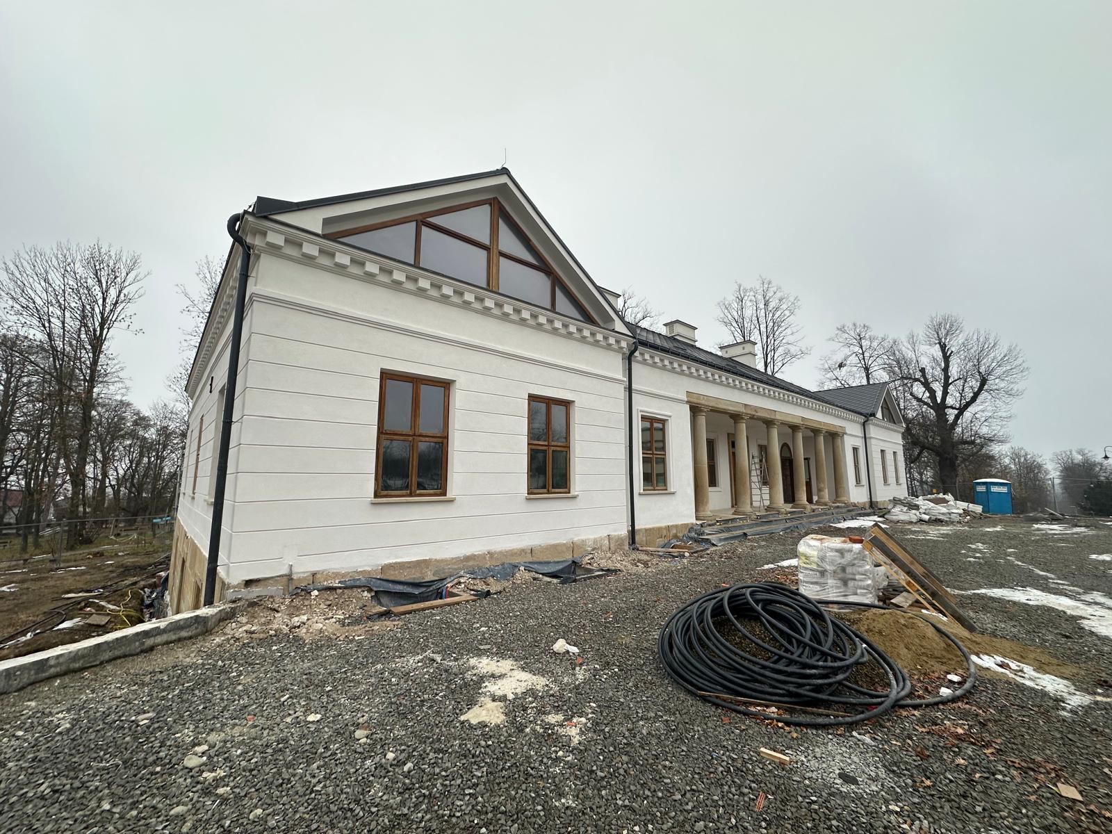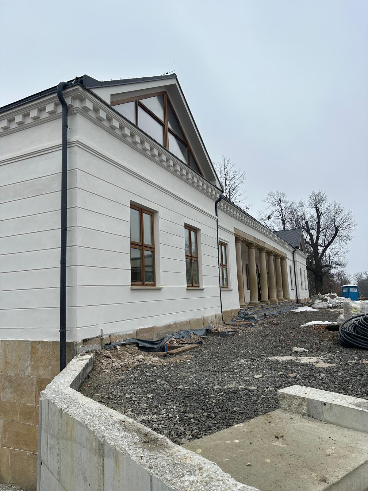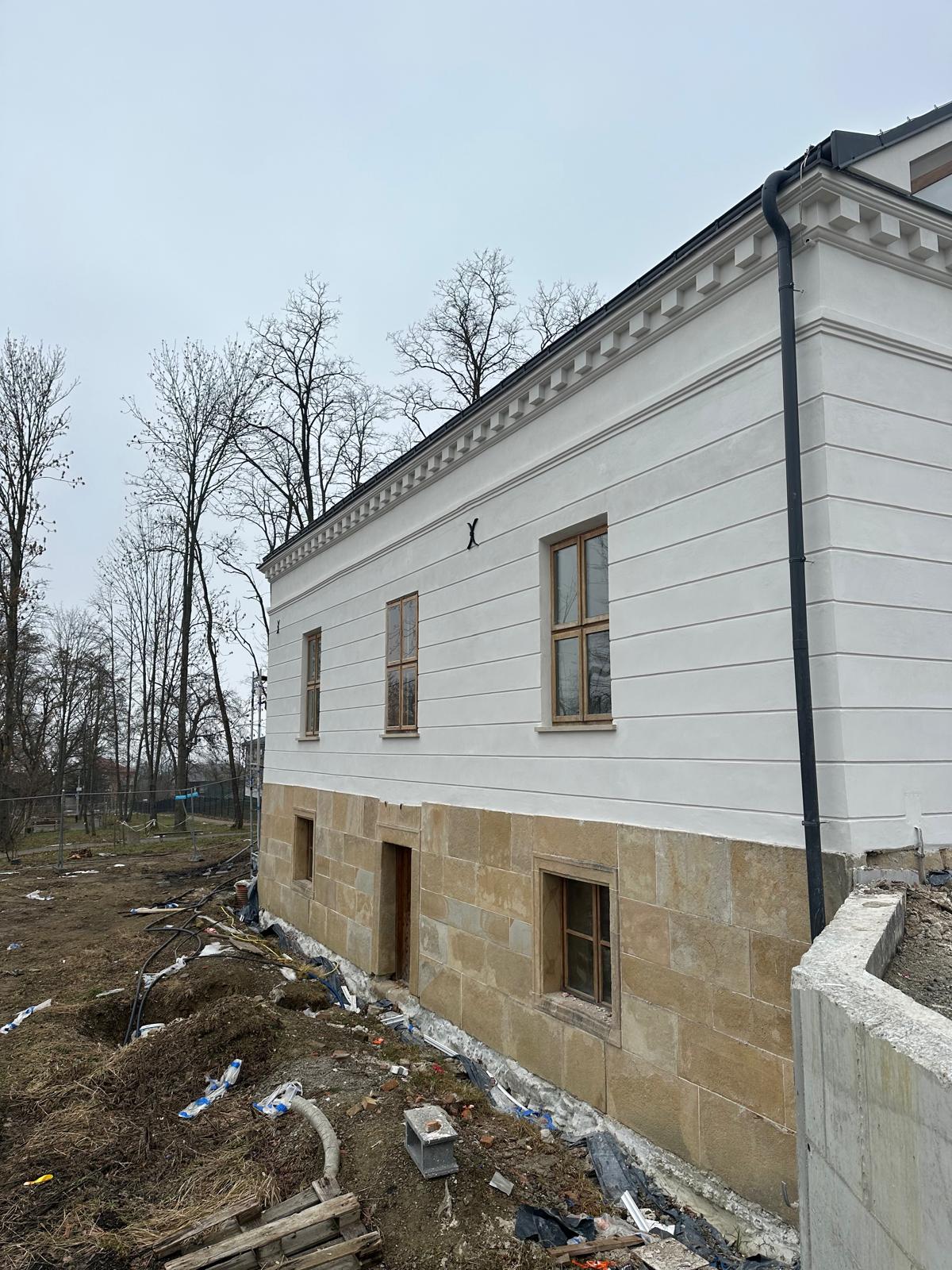 Roboty budowlane i konserwatorskie przy zabytkowym XIX‑wiecznym dworze Pilińskich, zakres prac: konserwacja kamiennego cokołu z uzupełnieniem szachtów okiennych, renowacja detali architektonicznych i kolumnady, odnowienie