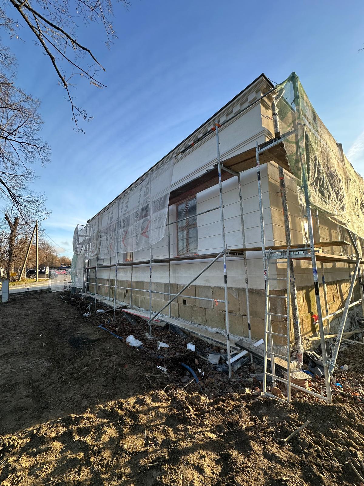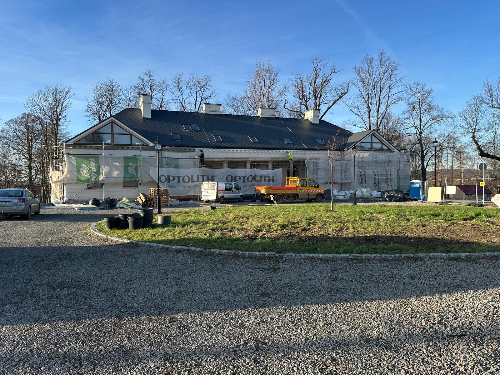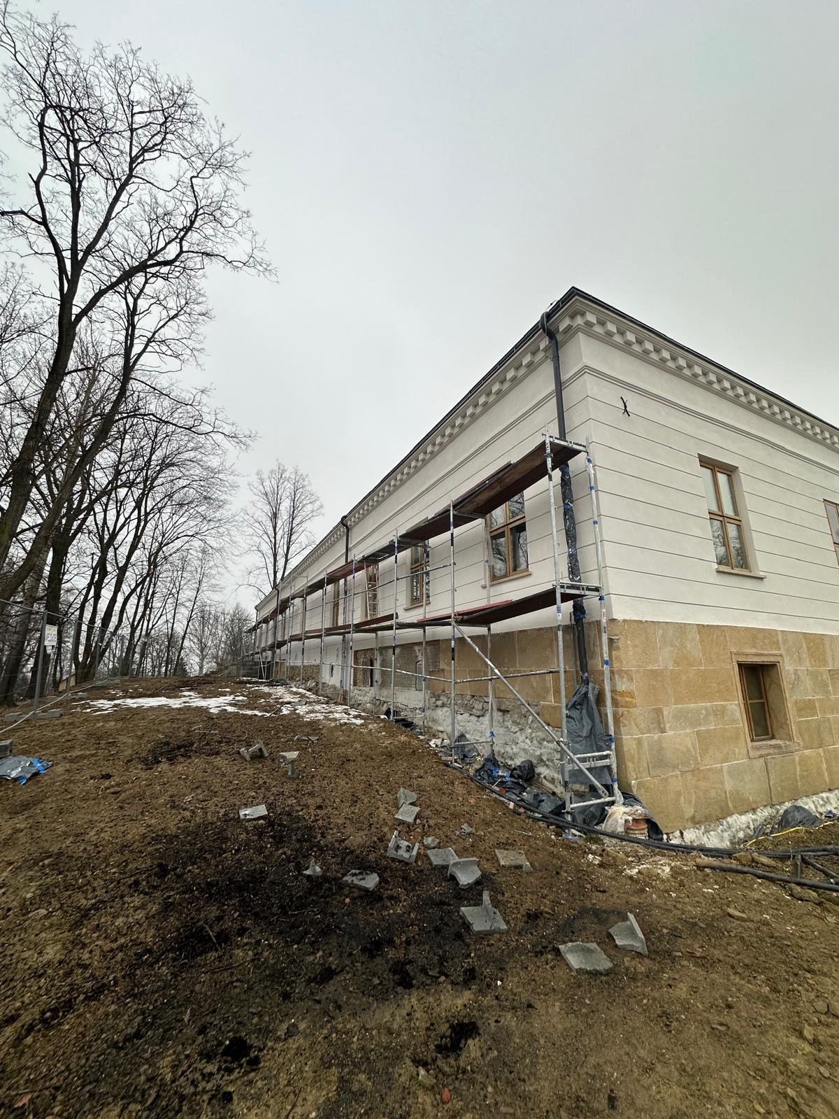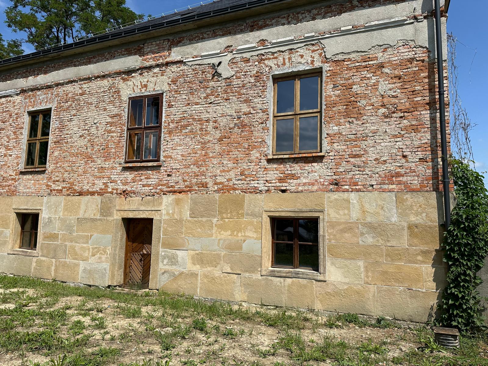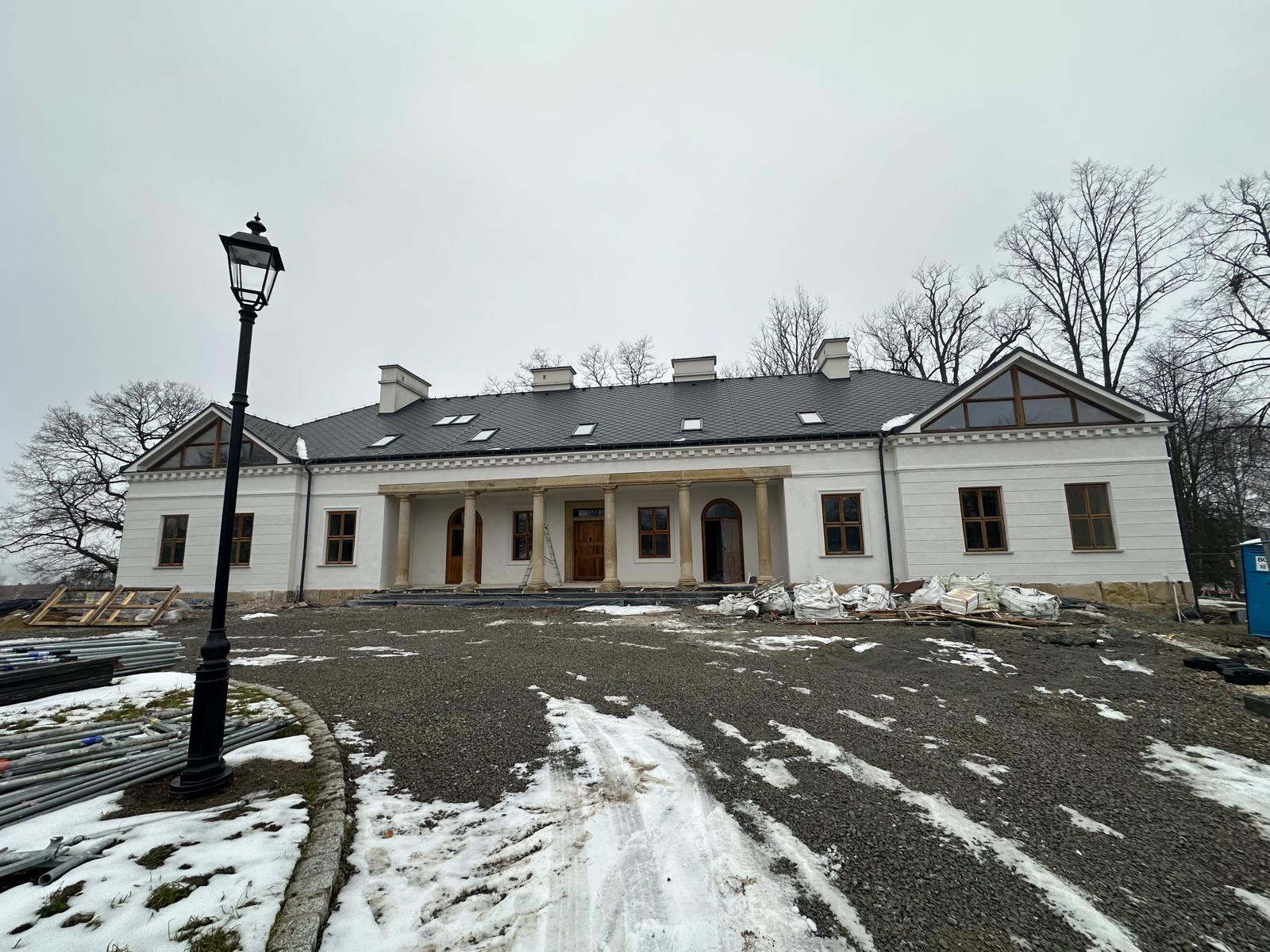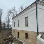 Roboty budowlane i konserwatorskie przy zabytkowym XIX‑wiecznym dworze Pilińskich, zakres prac: konserwacja kamiennego cokołu z uzupełnieniem szachtów okiennych, renowacja detali architektonicznych i kolumnady, odnowienie