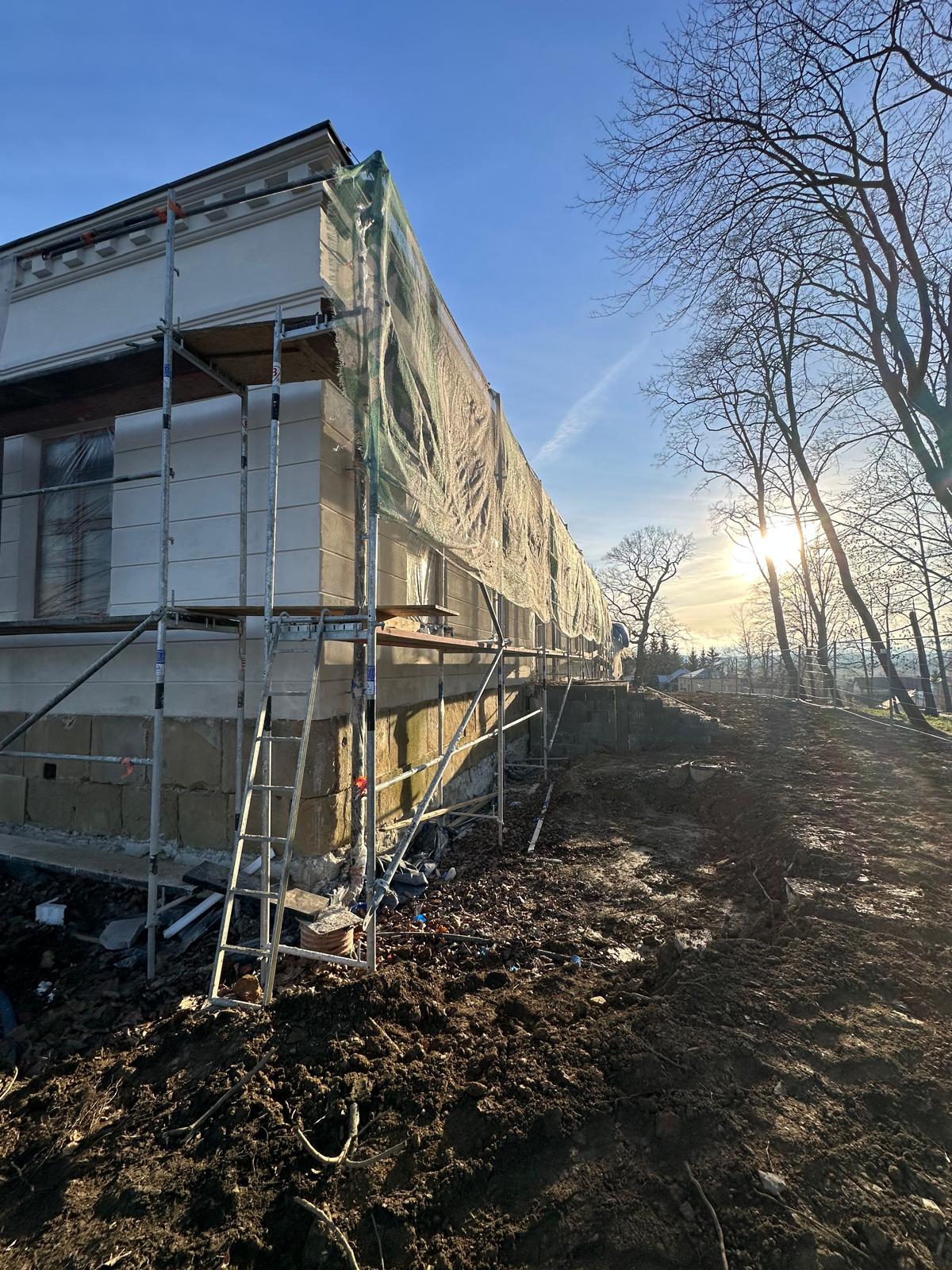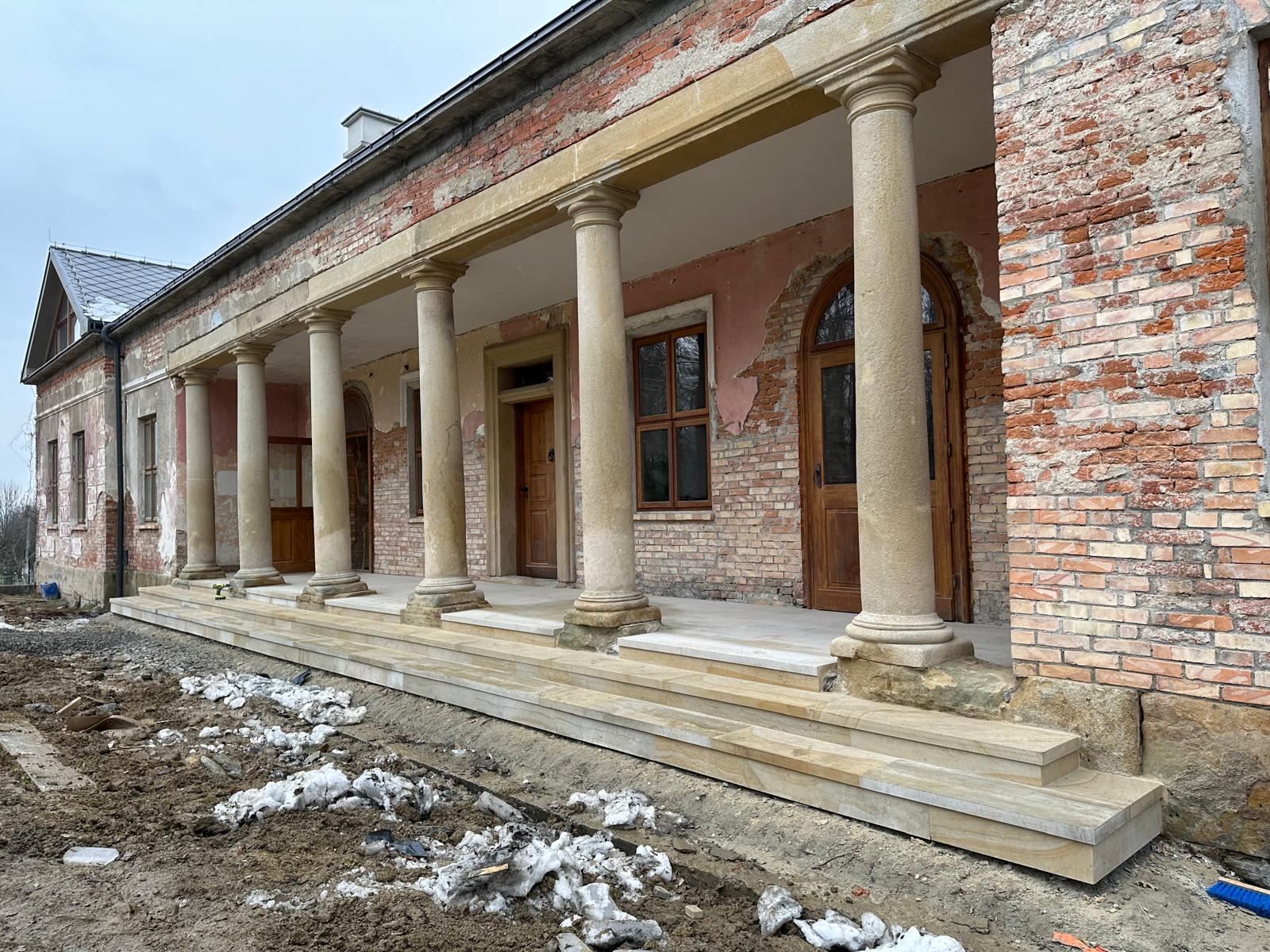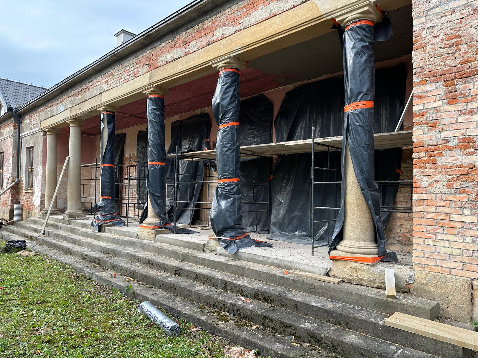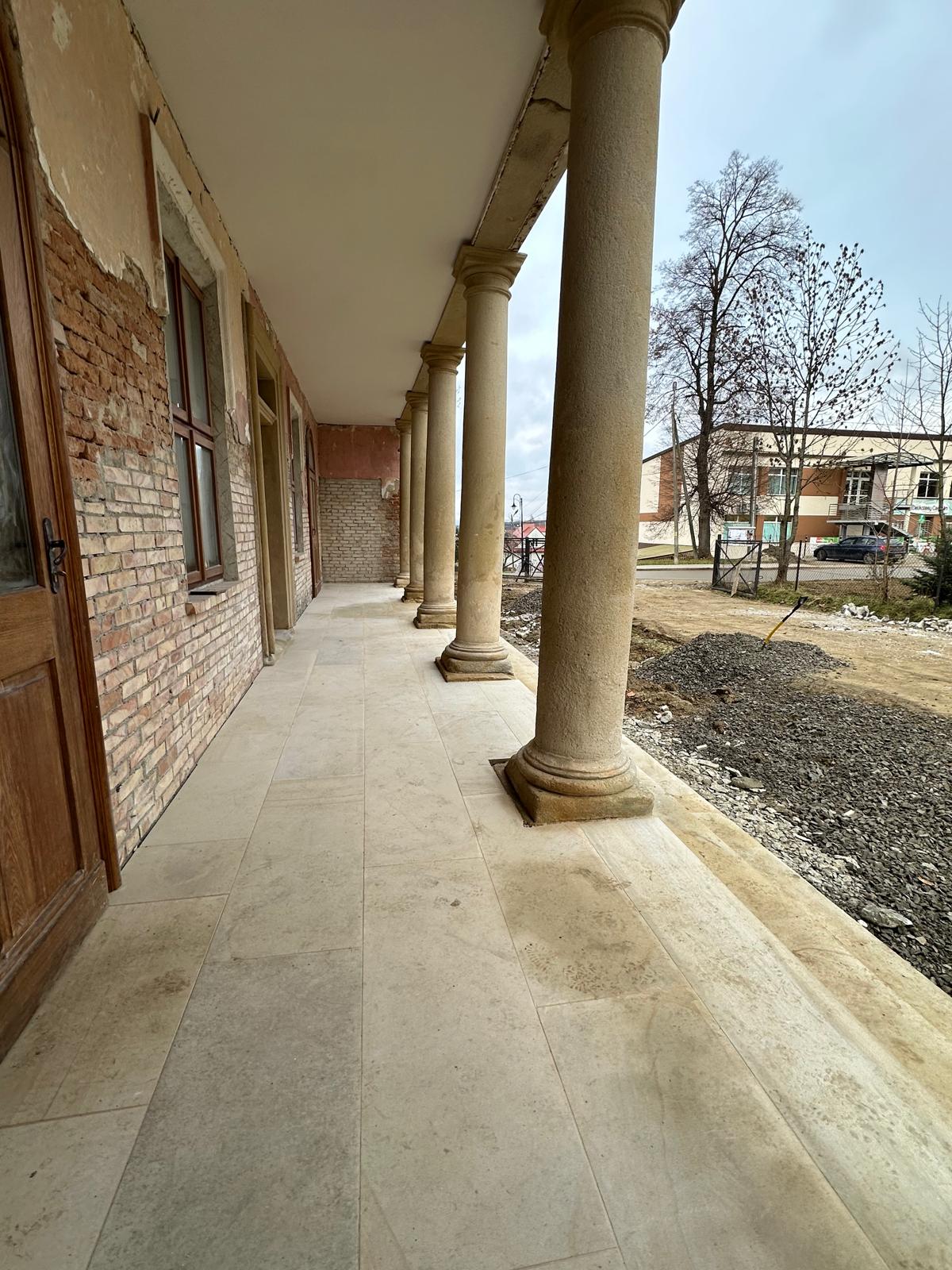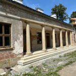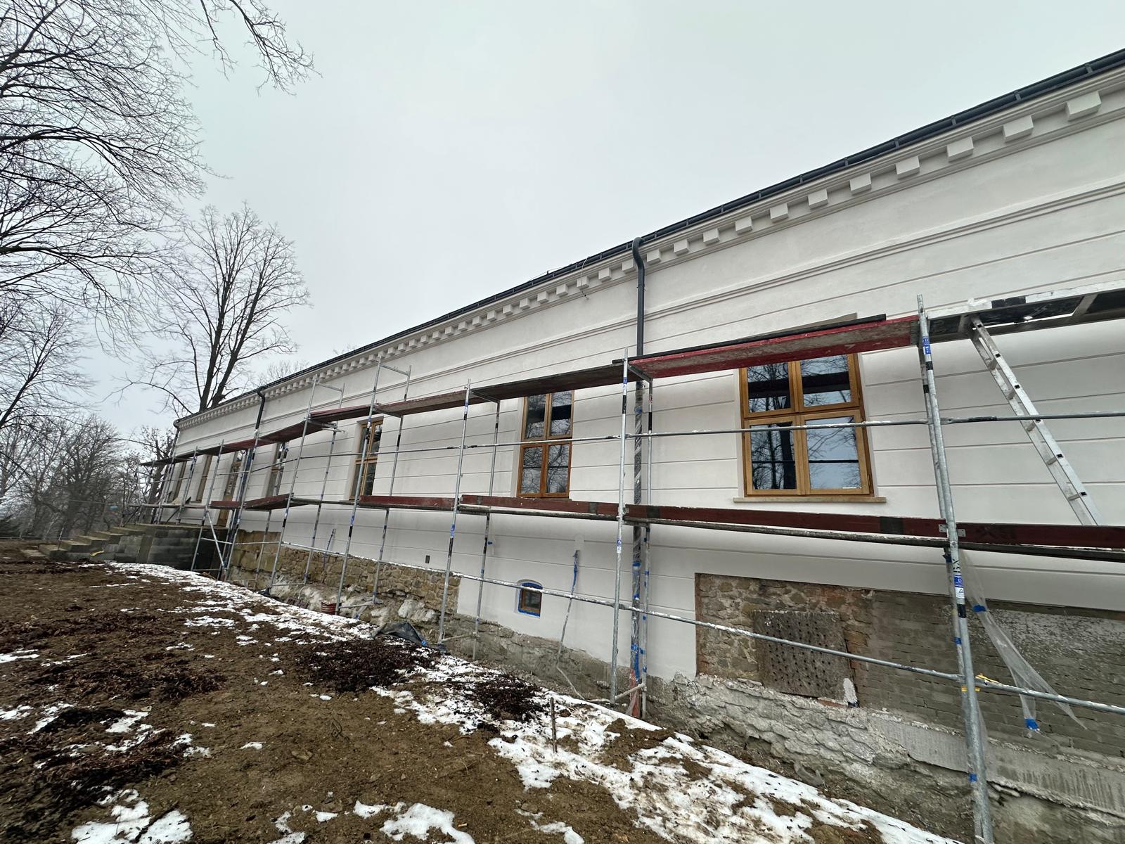 Roboty budowlane i konserwatorskie przy zabytkowym XIX‑wiecznym dworze Pilińskich, zakres prac: konserwacja kamiennego cokołu z uzupełnieniem szachtów okiennych, renowacja detali architektonicznych i kolumnady, odnowienie