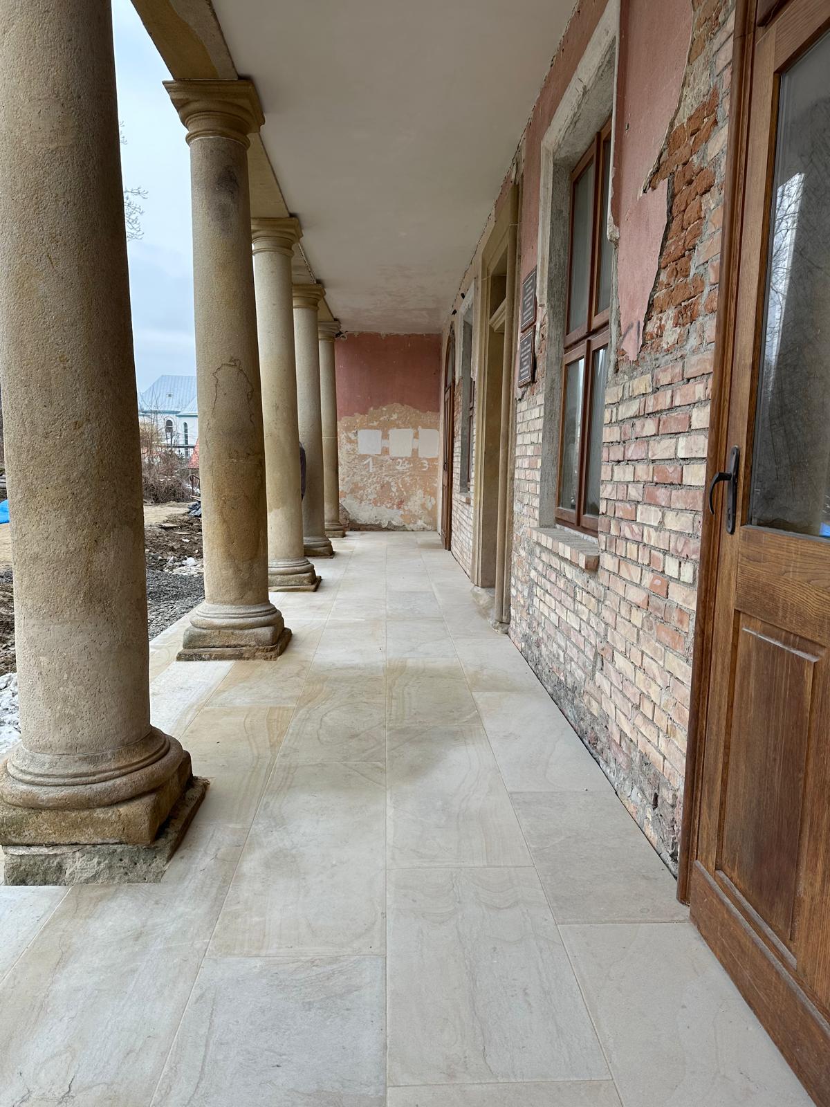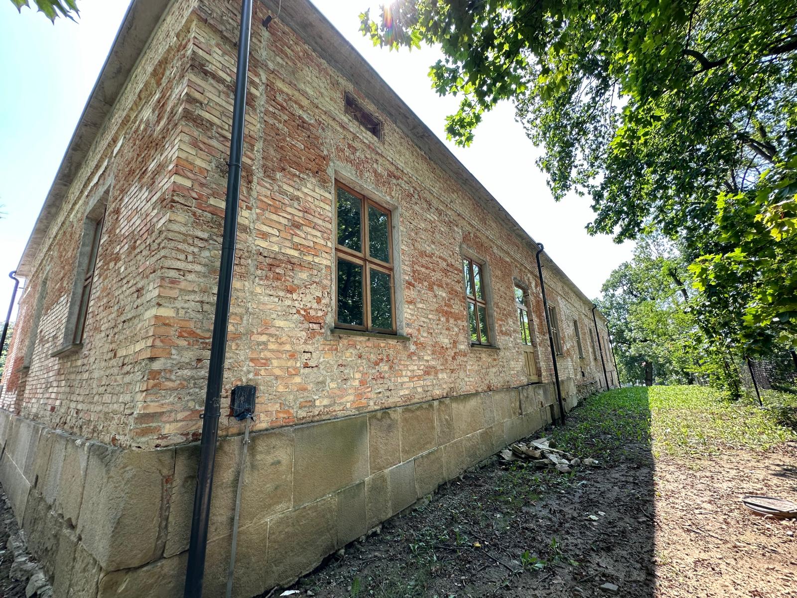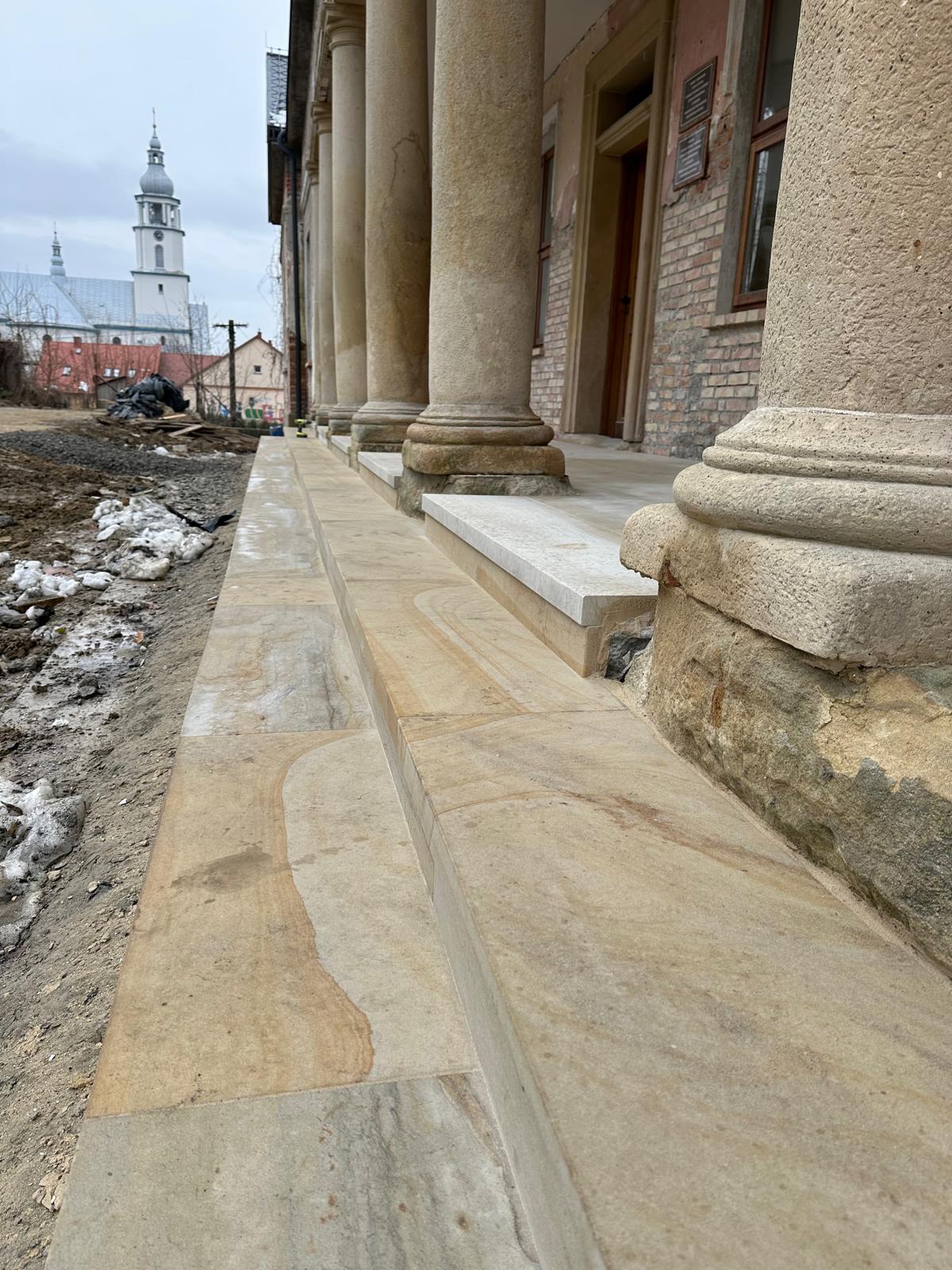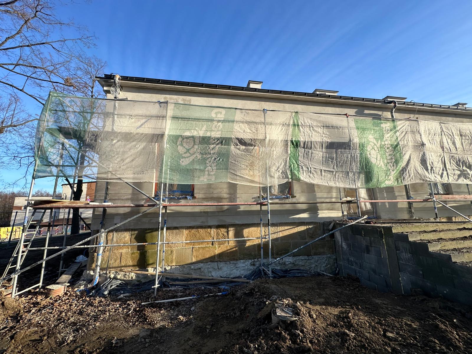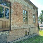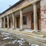 Roboty budowlane i konserwatorskie przy zabytkowym XIX‑wiecznym dworze Pilińskich, zakres prac: konserwacja kamiennego cokołu z uzupełnieniem szachtów okiennych, renowacja detali architektonicznych i kolumnady, odnowienie