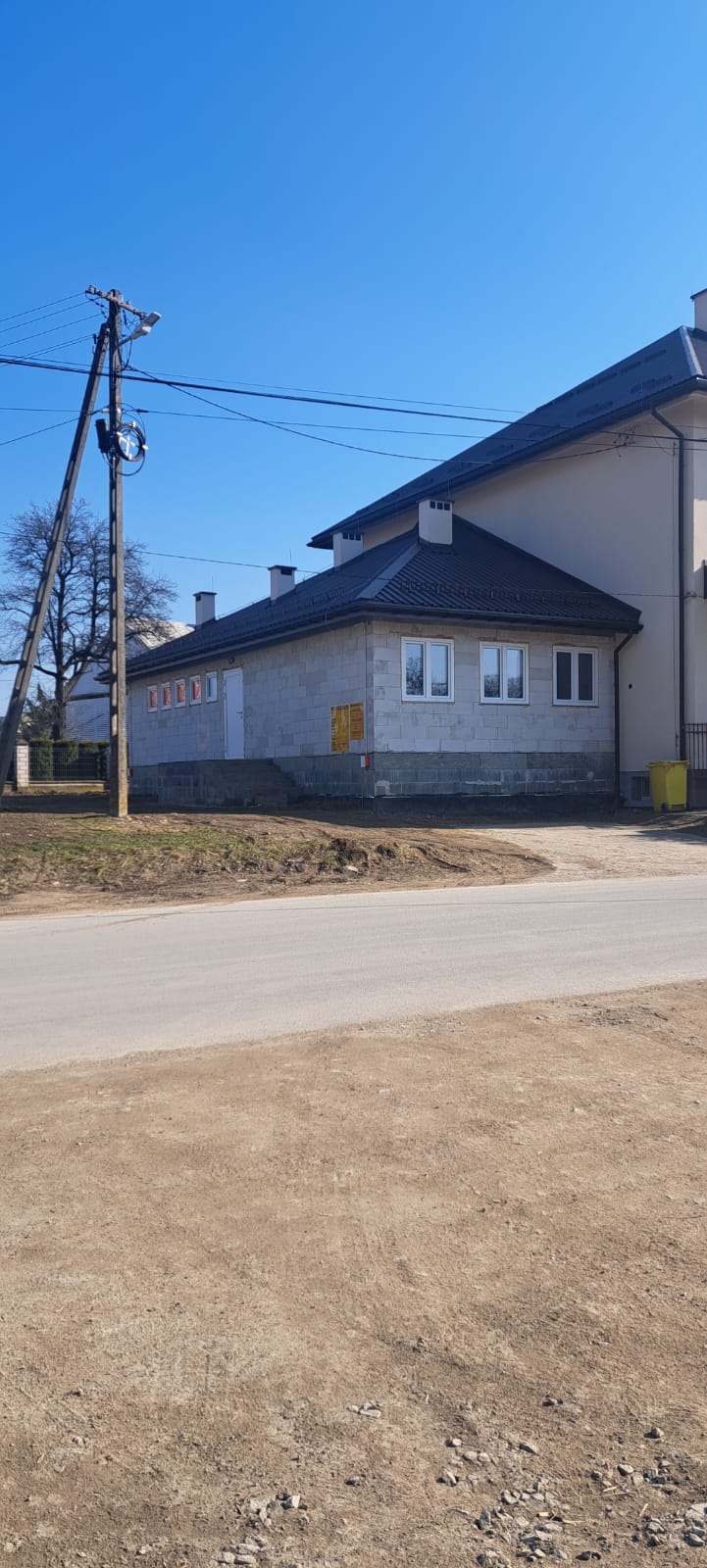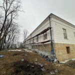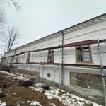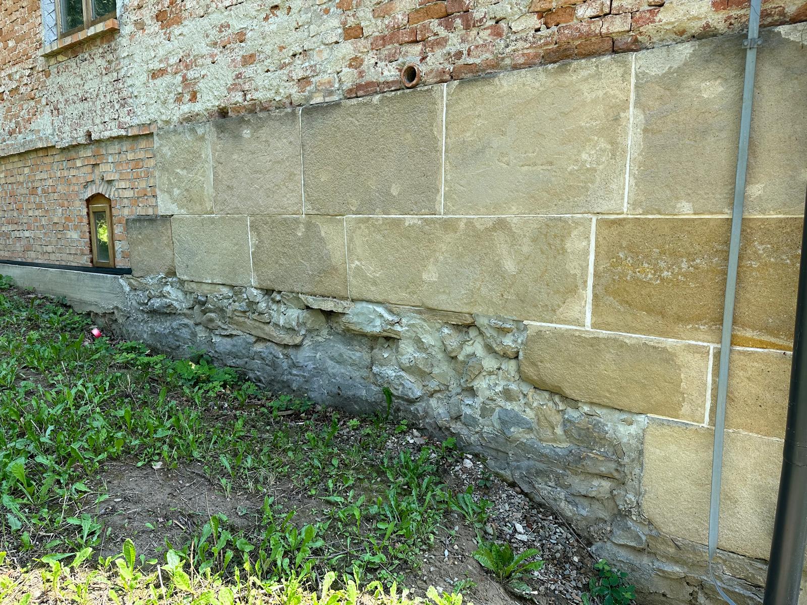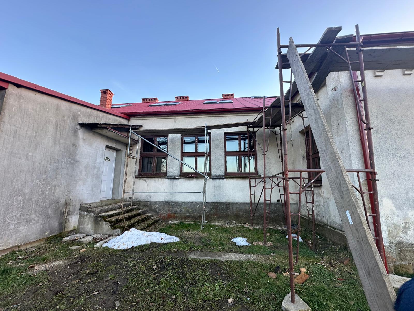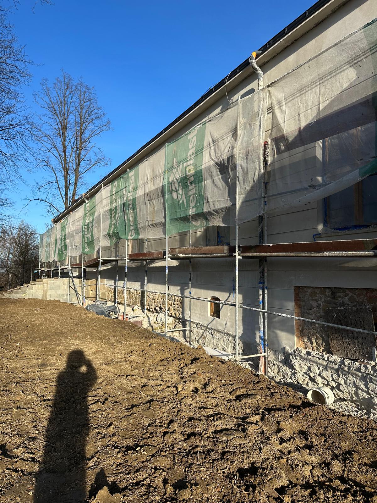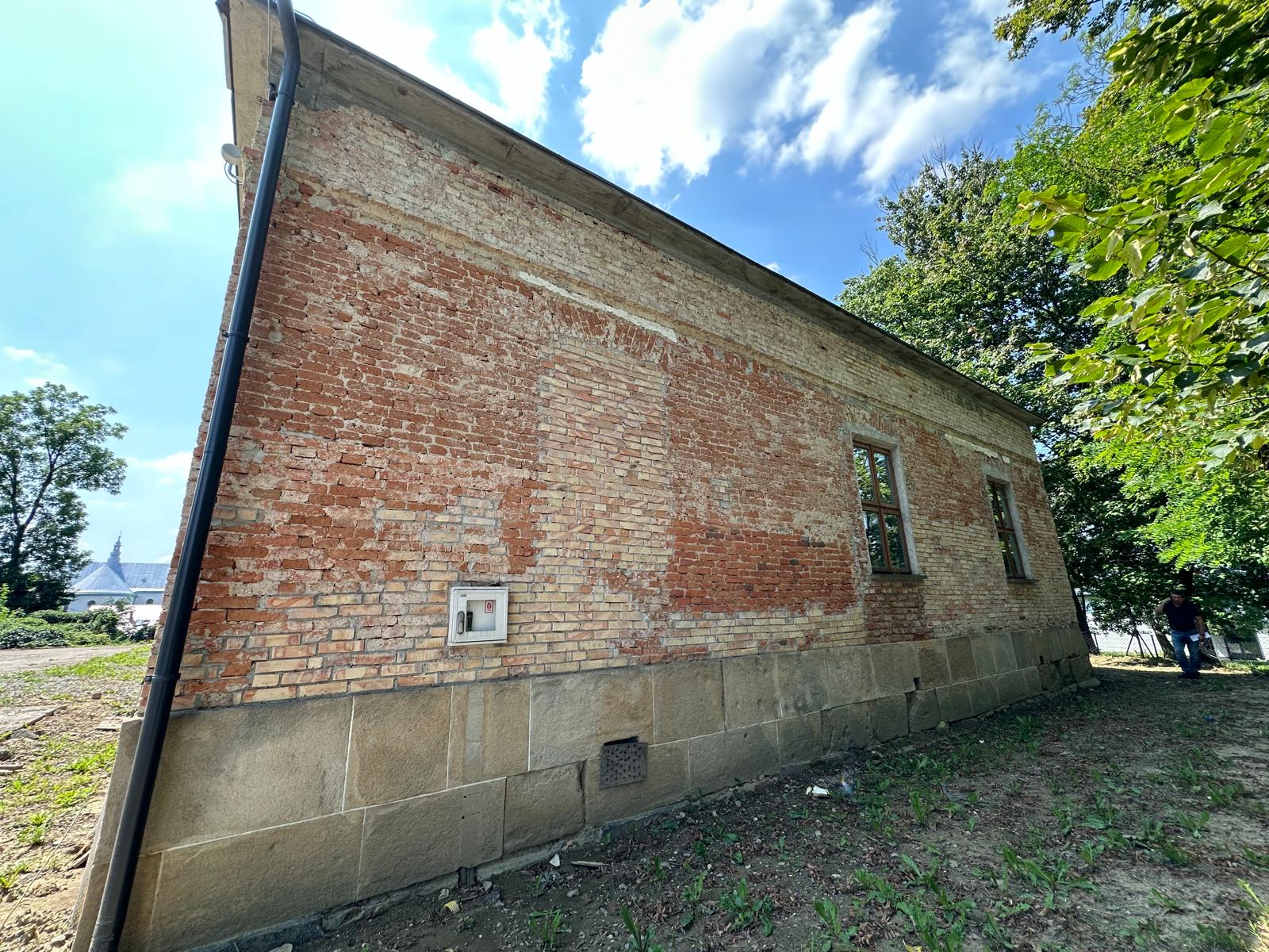 Roboty budowlane i konserwatorskie przy zabytkowym XIX‑wiecznym dworze Pilińskich, zakres prac: konserwacja kamiennego cokołu z uzupełnieniem szachtów okiennych, renowacja detali architektonicznych i kolumnady, odnowienie