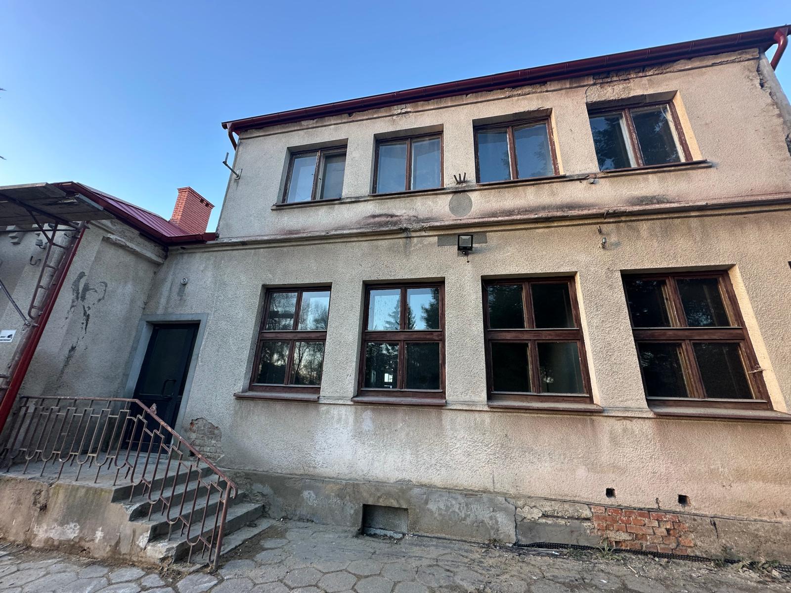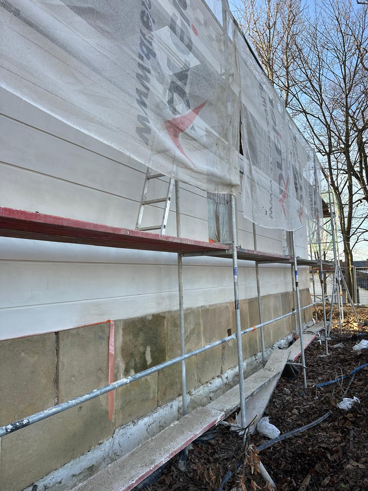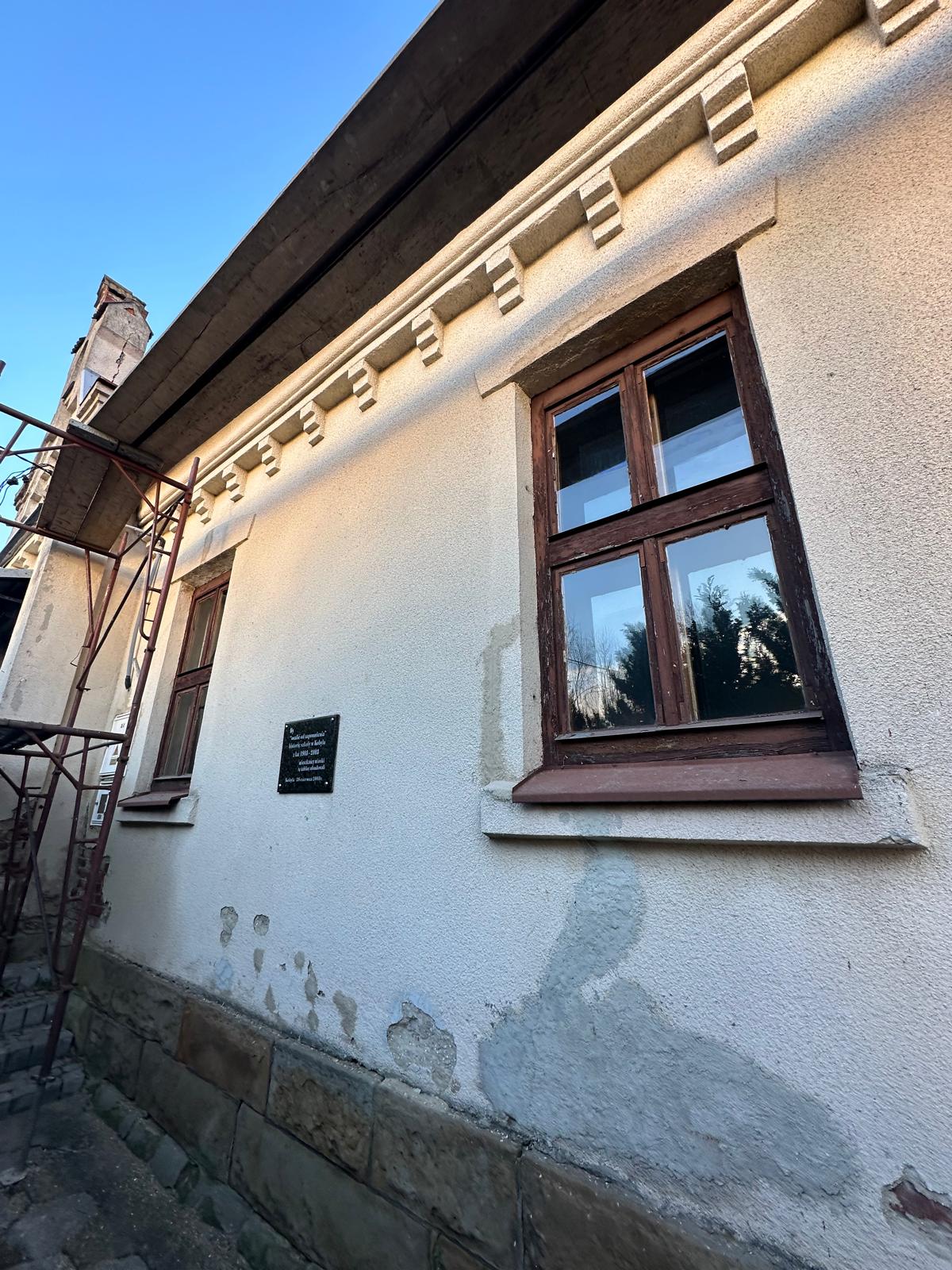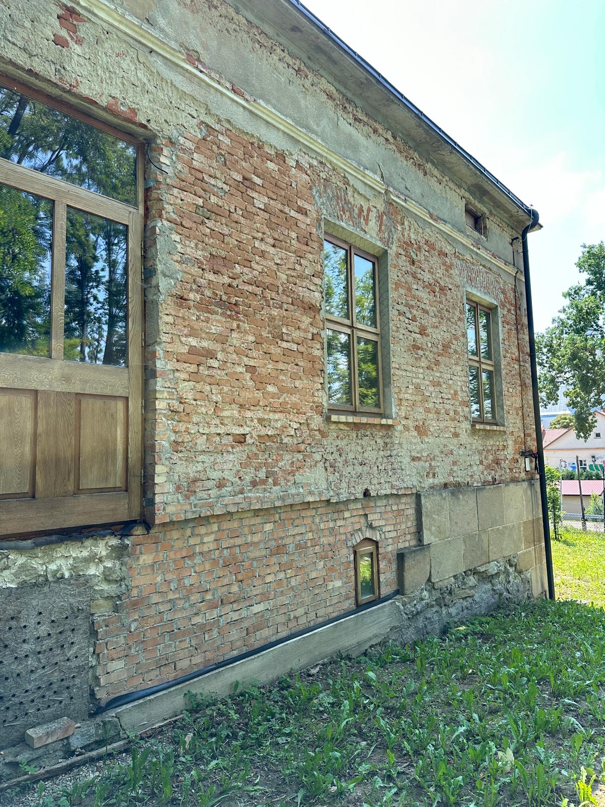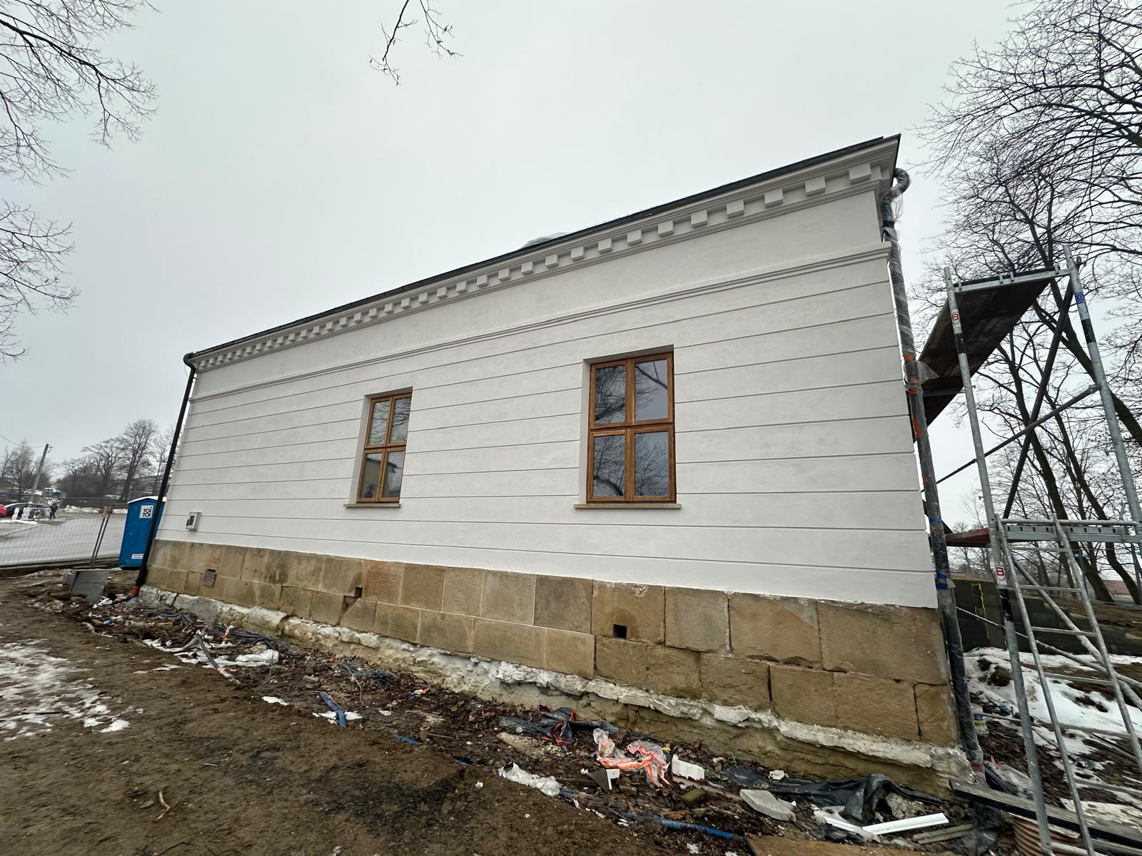 i uzupełnienie tynków elewacji, oczyszczenie i malowanie stolarki, wykonanie nowych schodów zewnętrznych z okładziną kamienną i balustradami, wykonanie instalacji oświetleniowej z lampami parkowymi i oświetleniem podcienia, utwardzenie obejścia i dojazdu, uporządkowanie otoczenia, wykonanie nowych nasadzeń i trawników, montaż ławek, koszy i elementów małej architektury.
