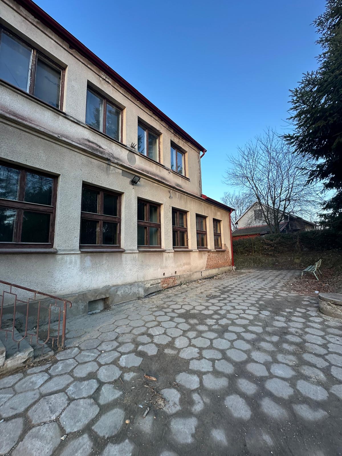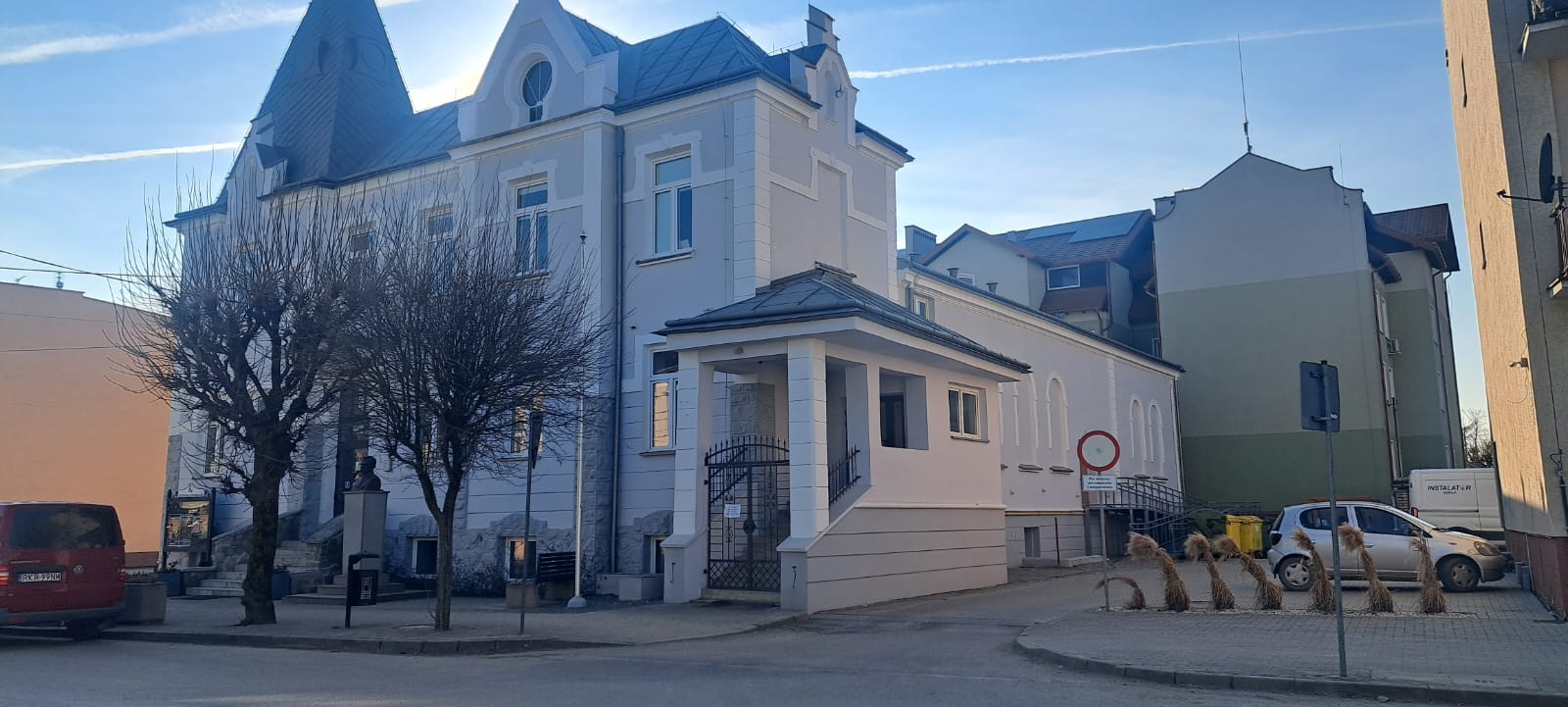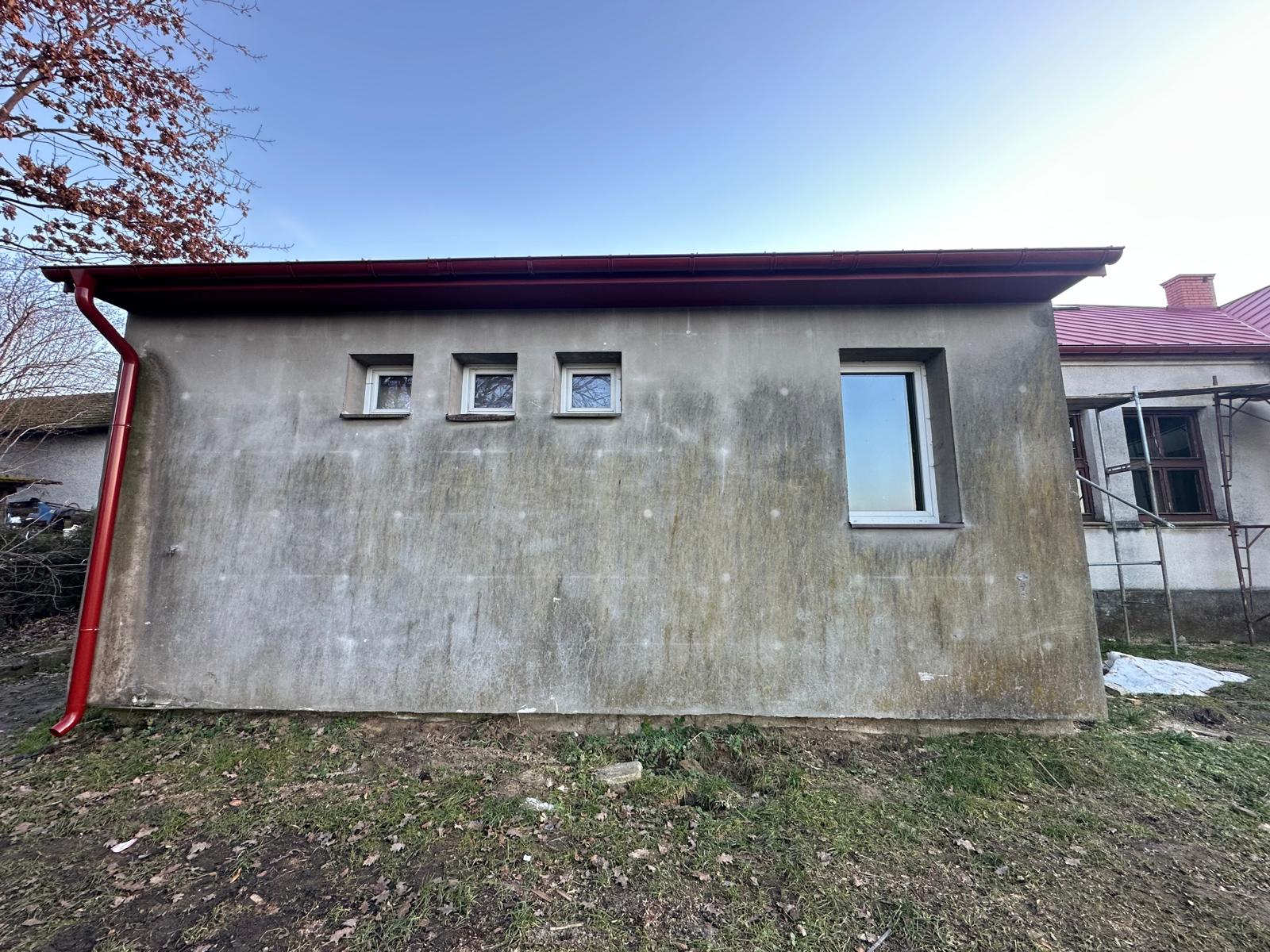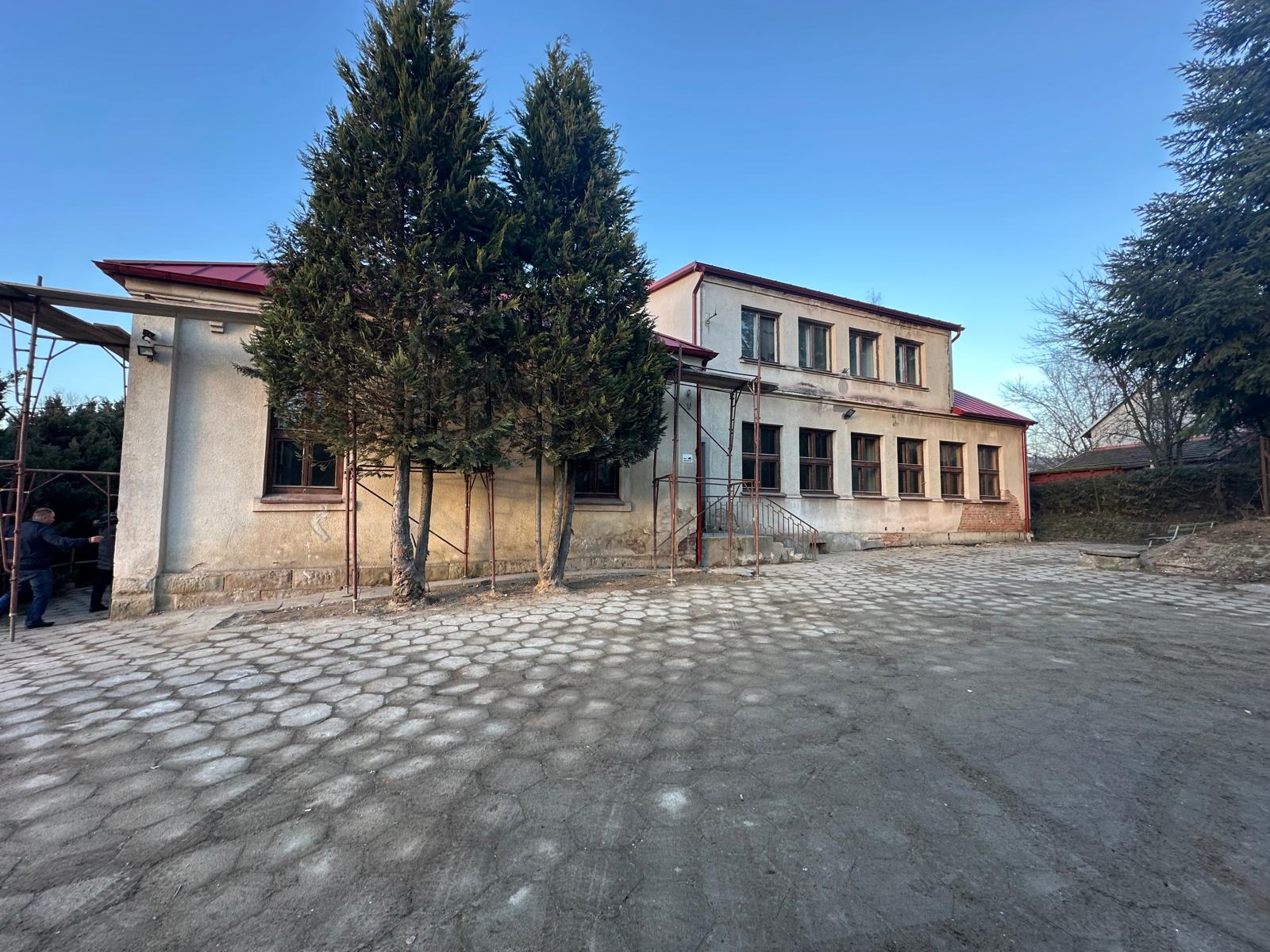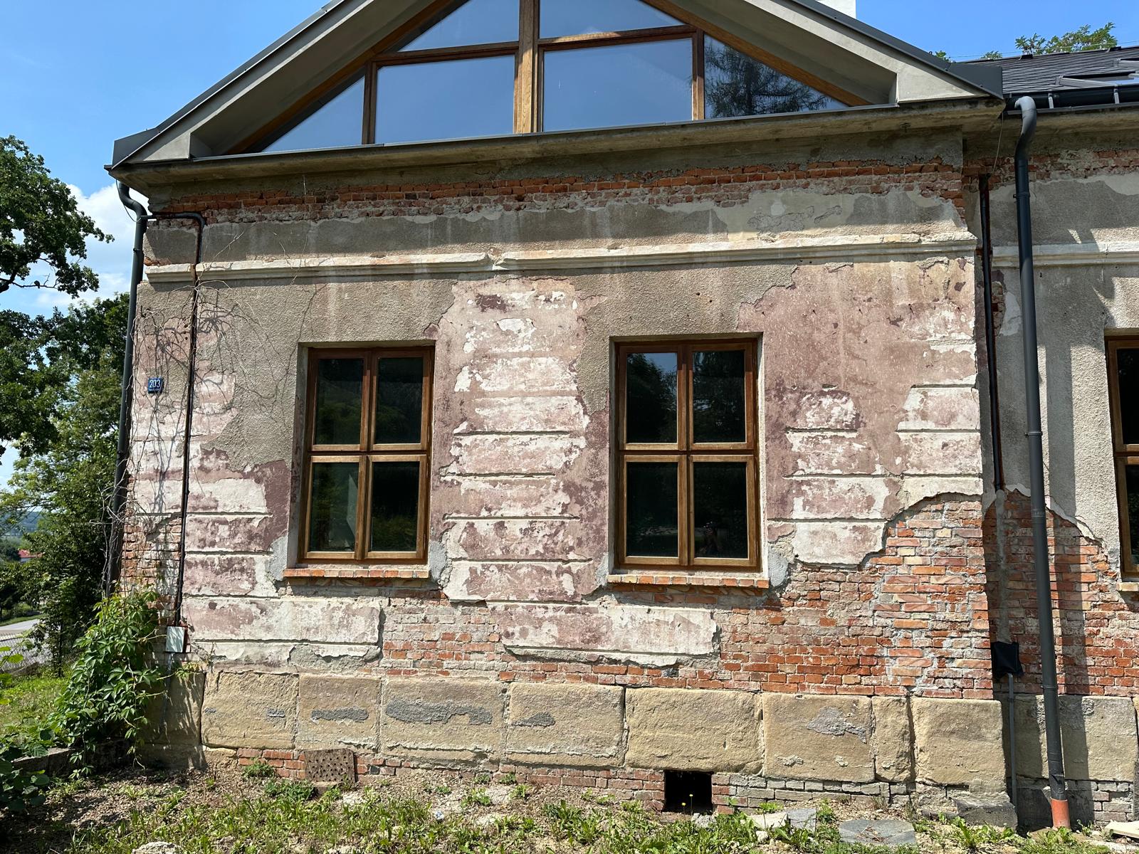 i uzupełnienie tynków elewacji, oczyszczenie i malowanie stolarki, wykonanie nowych schodów zewnętrznych z okładziną kamienną i balustradami, wykonanie instalacji oświetleniowej z lampami parkowymi i oświetleniem podcienia, utwardzenie obejścia i dojazdu, uporządkowanie otoczenia, wykonanie nowych nasadzeń i trawników, montaż ławek, koszy i elementów małej architektury.