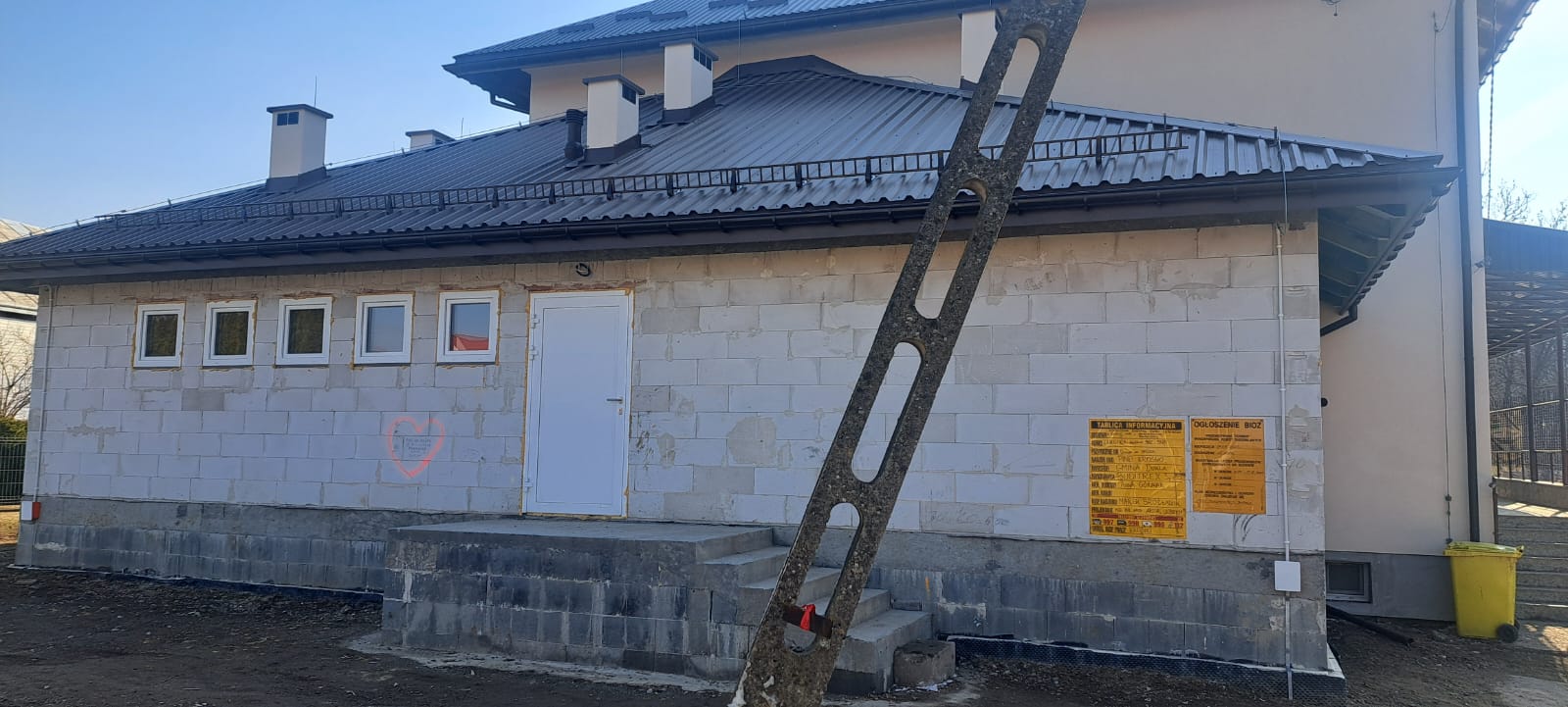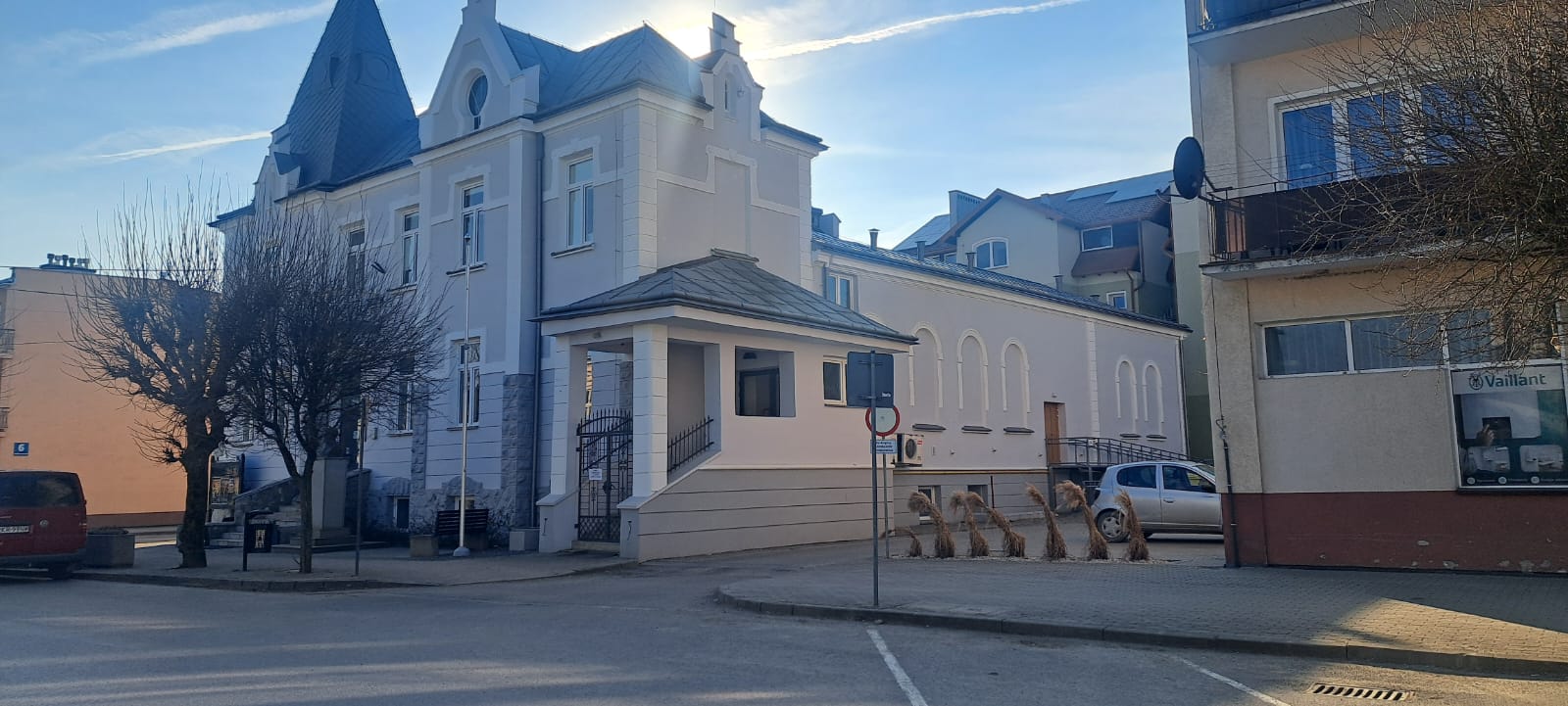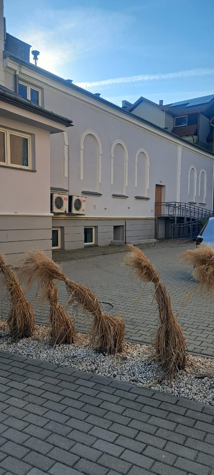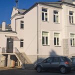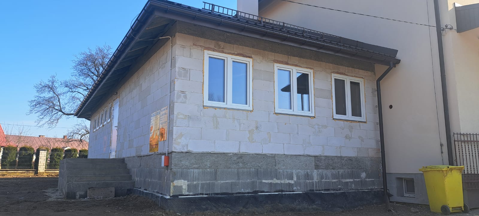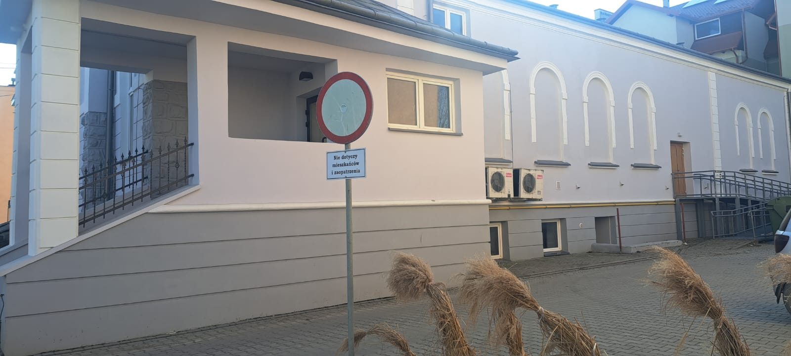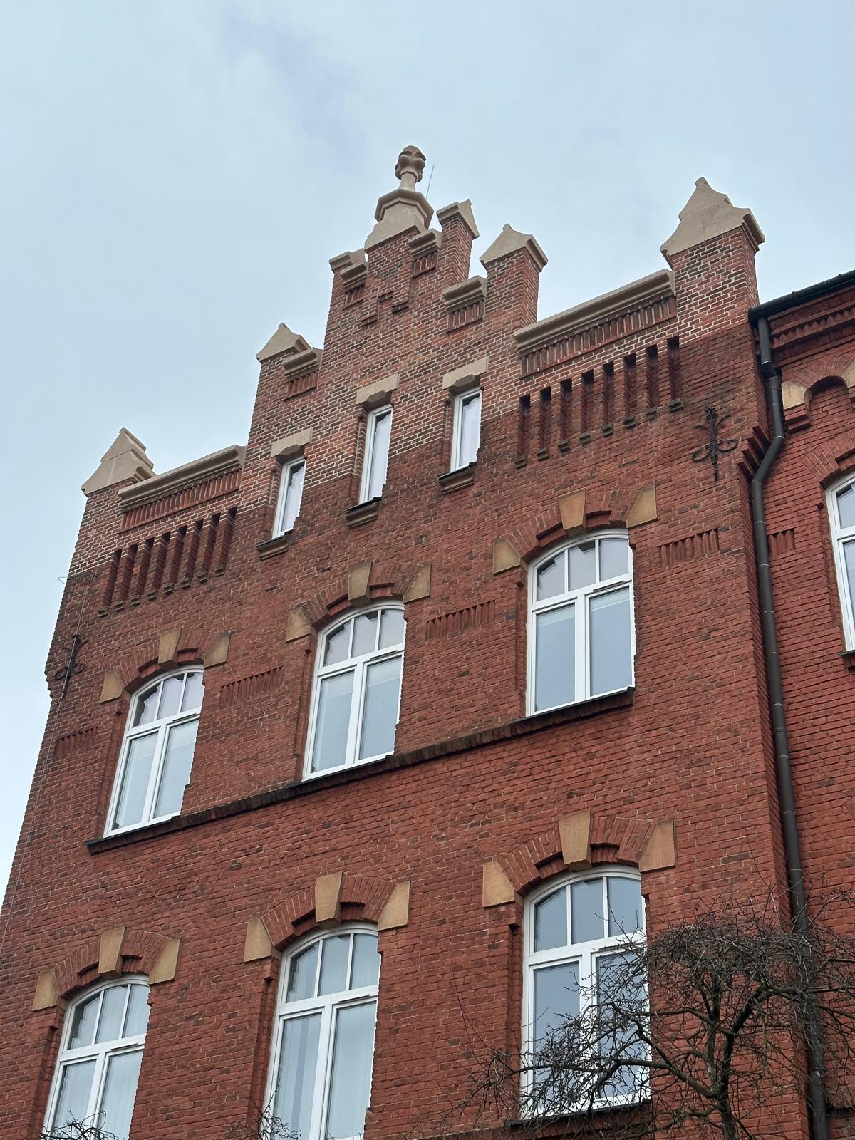 i uzupełnienie tynków elewacji, oczyszczenie i malowanie stolarki, wykonanie nowych schodów zewnętrznych z okładziną kamienną i balustradami, wykonanie instalacji oświetleniowej z lampami parkowymi i oświetleniem podcienia, utwardzenie obejścia i dojazdu, uporządkowanie otoczenia, wykonanie nowych nasadzeń i trawników, montaż ławek, koszy i elementów małej architektury.