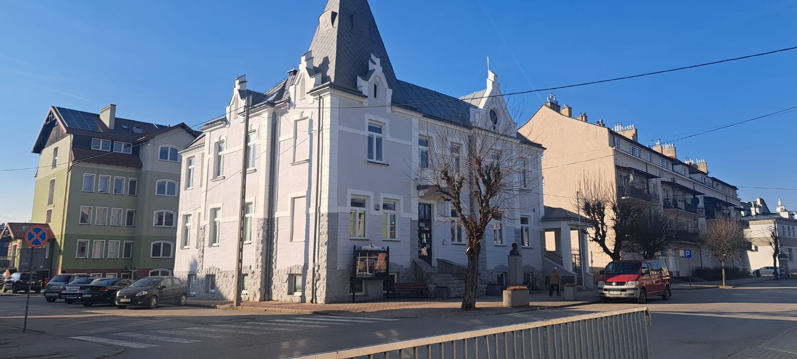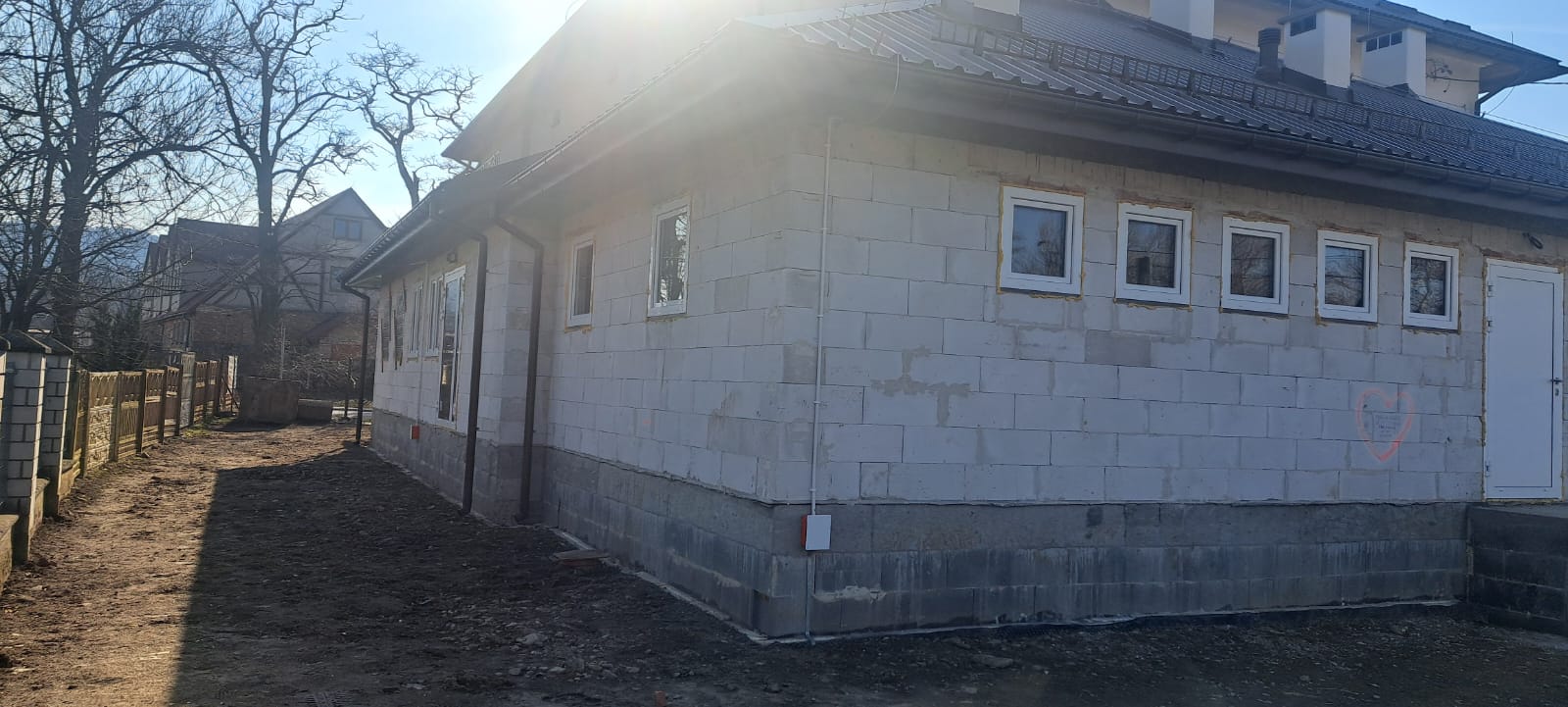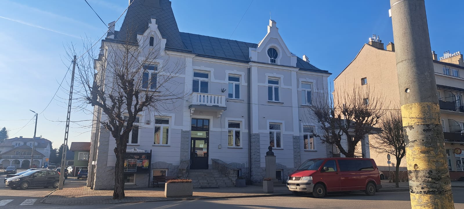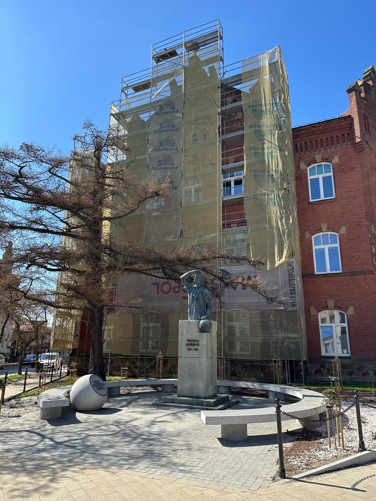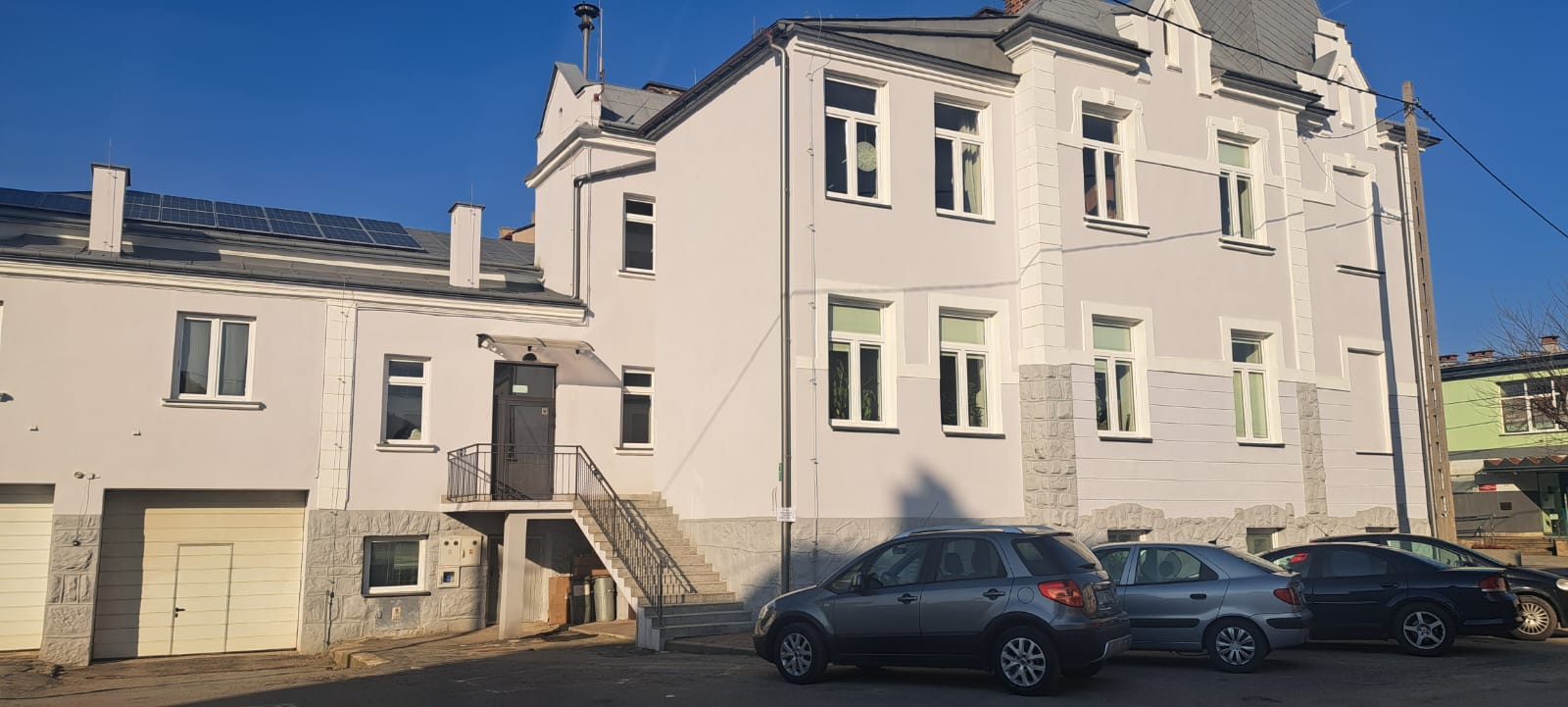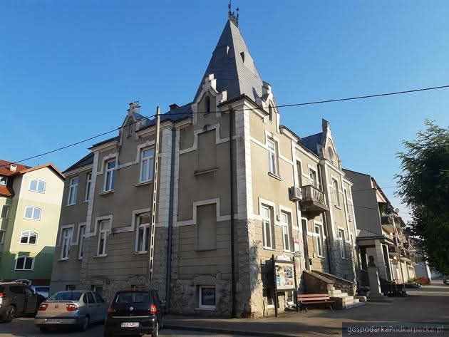 i uzupełnienie tynków elewacji, oczyszczenie i malowanie stolarki, wykonanie nowych schodów zewnętrznych z okładziną kamienną i balustradami, wykonanie instalacji oświetleniowej z lampami parkowymi i oświetleniem podcienia, utwardzenie obejścia i dojazdu, uporządkowanie otoczenia, wykonanie nowych nasadzeń i trawników, montaż ławek, koszy i elementów małej architektury.